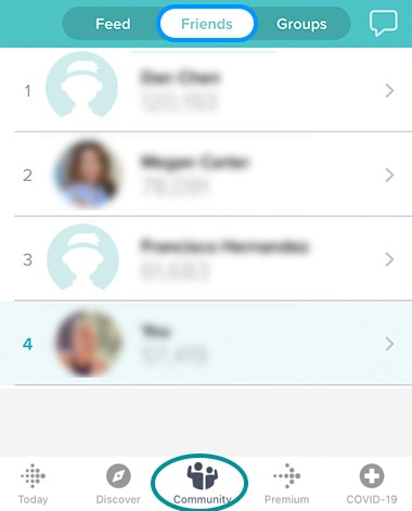 To see your list of connected friends, tap the Community tab and choose Friends. Your friends are listed in order based on their most recent 7-day step total.