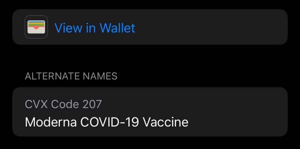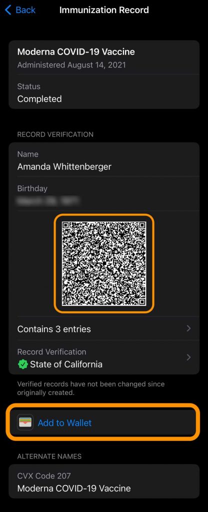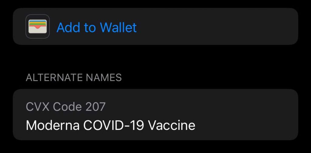 - For folks using iOS 15.1 and above and watchOS 8.1 and higher, you can also add this record to your Apple Wallet app using the Add to Wallet button.