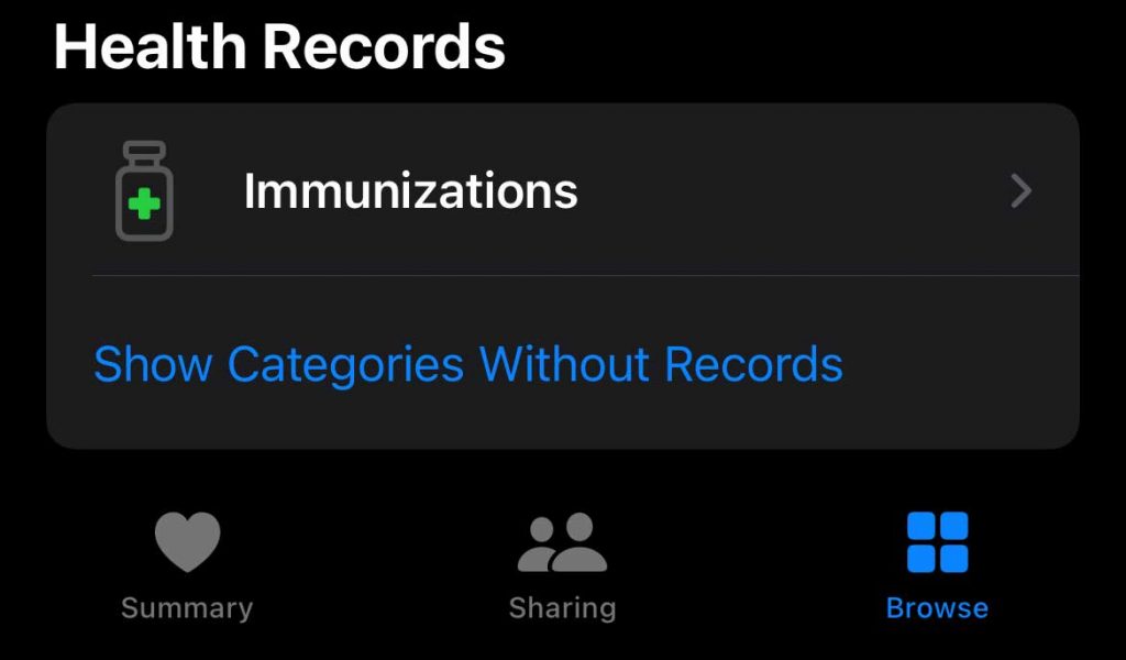 - Once integrated, go to the Health app > Browse > Health Records > Immunizations to view your vaccinations.