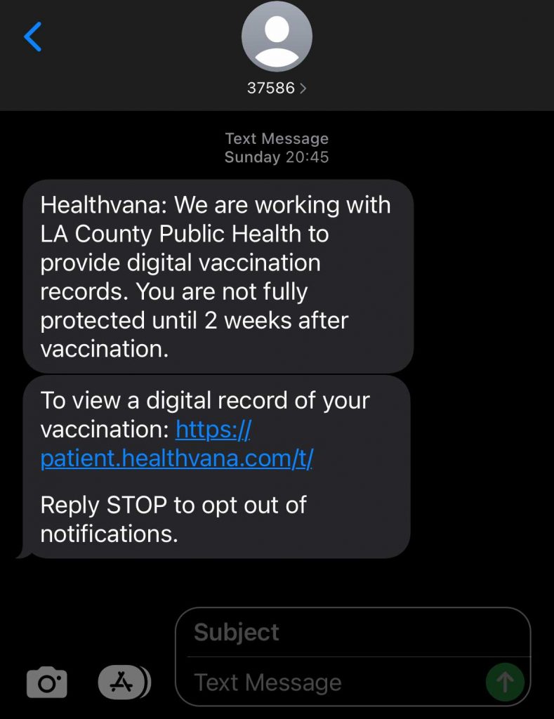 I was lucky enough to get both a text message and email from LA County’s digital vaccine records provider.