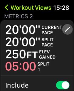 Since Apple limits ANY workout view to show no more than five metrics on the watch’s screen, you might need to hide or swap/remove a metric before adding a different one.