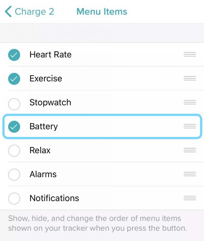 For older model Fitbits that run the legacy Fitbit app (not Google’s redesigned app), open the Fitbit app and turn on the battery screen option via Account > Menu Items > Battery. Once enabled, you will find a battery screen available on your device when you press and hold its side button.