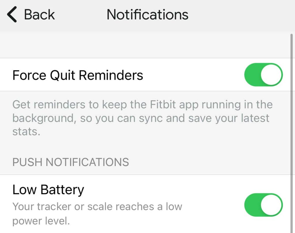 - Toggle on Force Quit Reminders to get reminders if the Fitbit app isn’t running in the background. Then, scroll down on the notification options and, under Push Notifications, toggle on Low Battery.