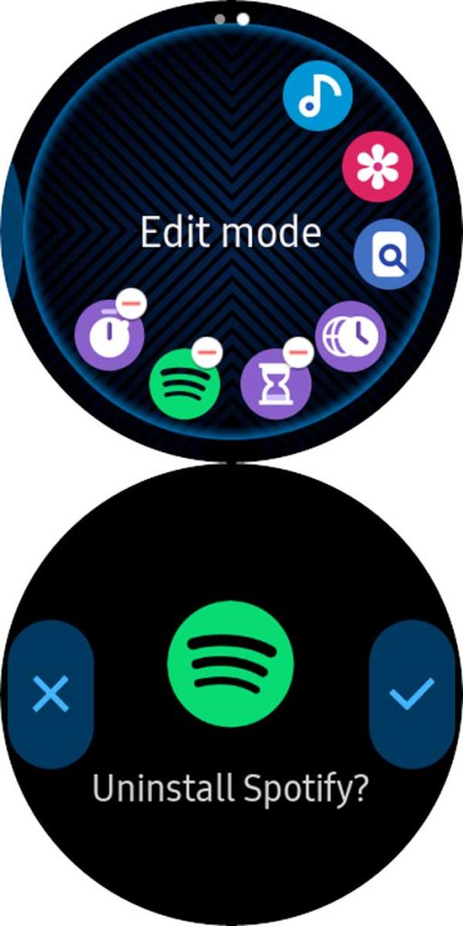 - For Tizen watches, touch and hold on the apps screen. Tap the Minus sign icon and then tap the checkmark to confirm you wish to delete that app.