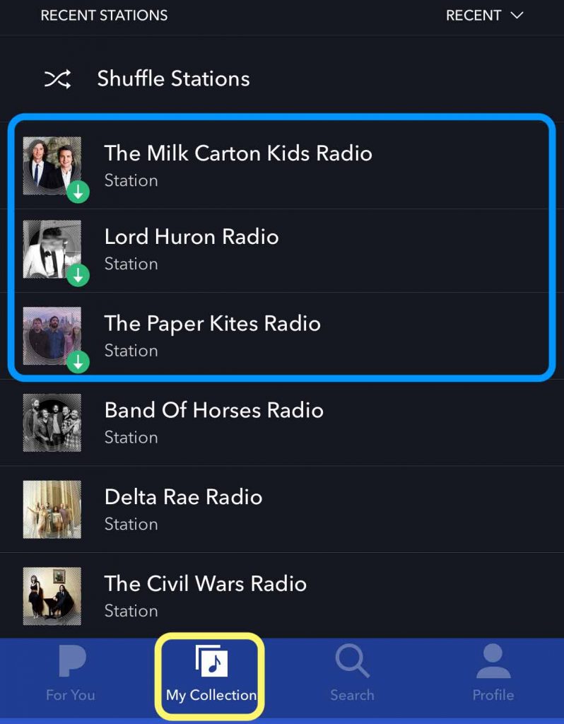 - Once Pandora successfully downloads your music, tap the My Collection tab in the Pandora app and look for a green download icon next to that station or music.
