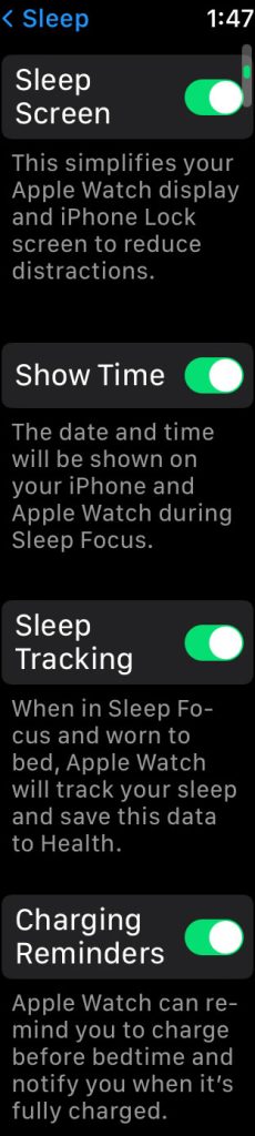 Let’s try looking at the settings on your watch. On your watch, open the Settings app and choose Sleep. Toggle on Turn on at Bedtime, then scroll down and you should find Sleep Tracking–make sure this is on.