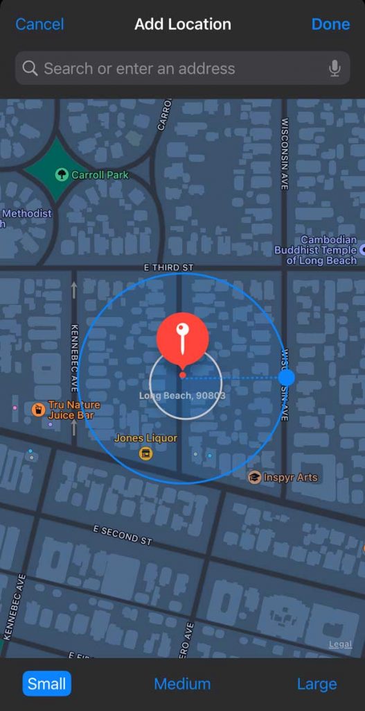 - To add a different location than your current, enter the address of the location you want to add to the exceptions list. Once that location is on screen, adjust the boundary of that location by changing the circle size or choosing Small, Medium, or Large. When complete, tap Done to save your updates.