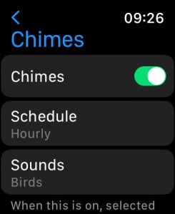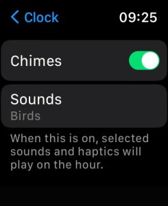 You can also adjust this setting on your iPhone using the Watch app. Open the Watch app > My Watch tab > Clock app > Chimes. Don’t forget to choose your preferred sound (birds or bells.)