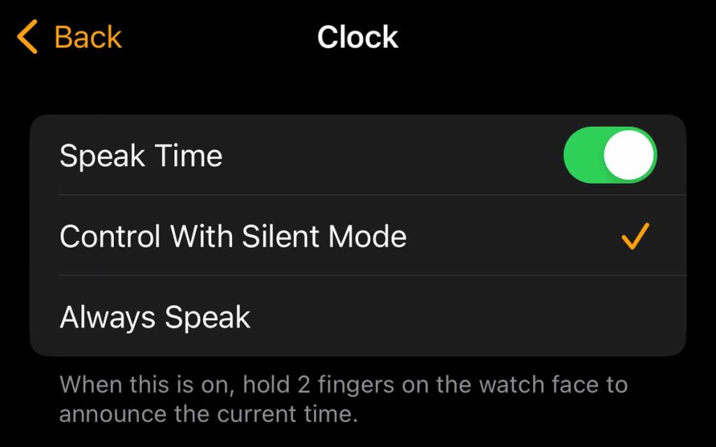 - Choose if you want it always to speak the time (Always Speak) or to mute when you turn on silent mode (Control with Silent Mode.)