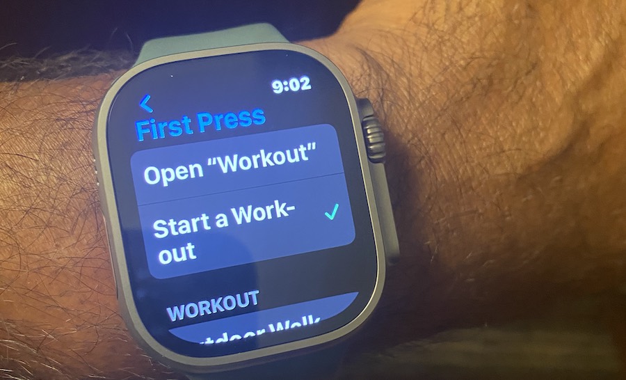 - When configuring the Action button for Workout, you had two choices: Open the workout app or Start a Workout (during configuration of First Press Action as shown in the steps above.)