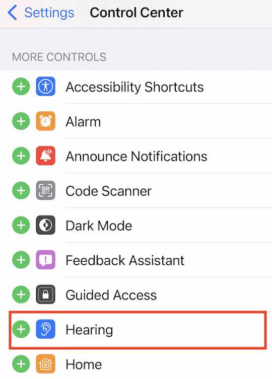 - Scroll down and from the section ‘MORE CONTROLS,’ choose ‘Hearing’ by tapping on the ‘+” sign on the left.