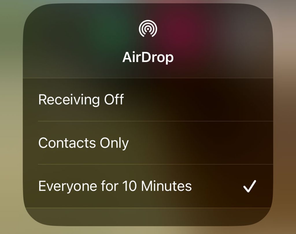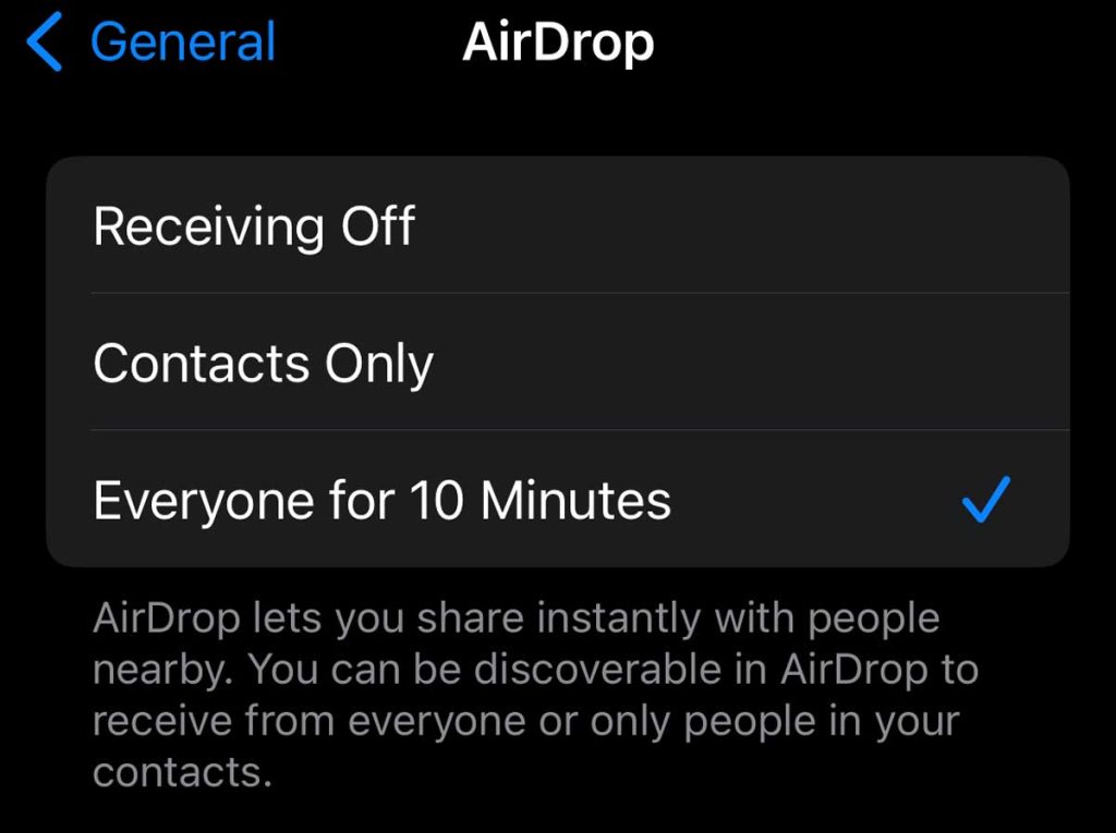 When you choose Everyone for 10 Minutes, all nearby Apple devices using AirDrop can see your iPhone for the next 10 minutes. After that time, AirDrop reverts to the default of Contacts Only.