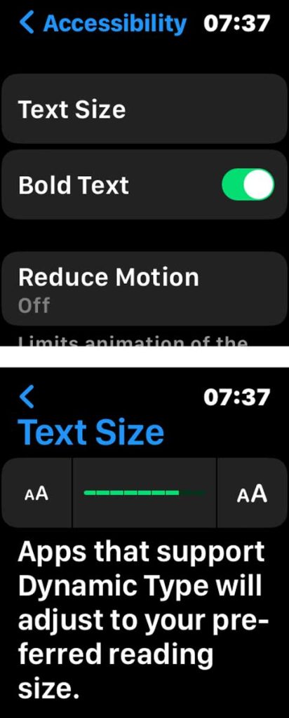 You also select what text size and boldness the Apple Watch uses here– so this is a critical step!