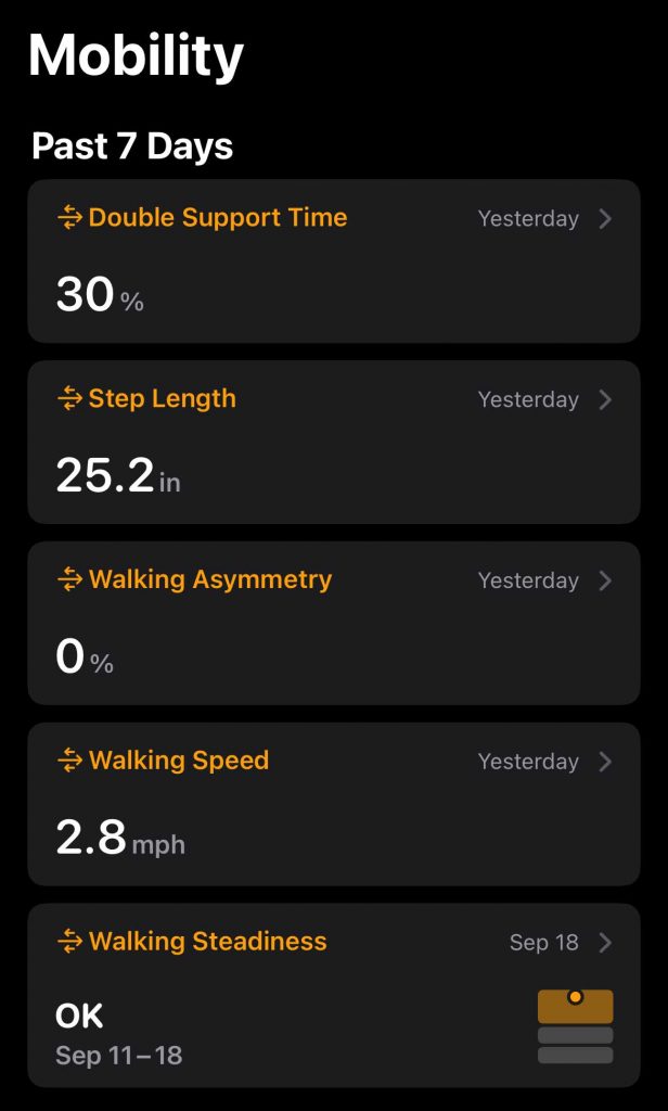 Apple offers this feature on iPhone 8 or later updated to iOS 15 and above. Whenever you walk with your iPhone, your phone tracks your mobility metrics, including your walking speed, step length, double support time, and walking asymmetry.