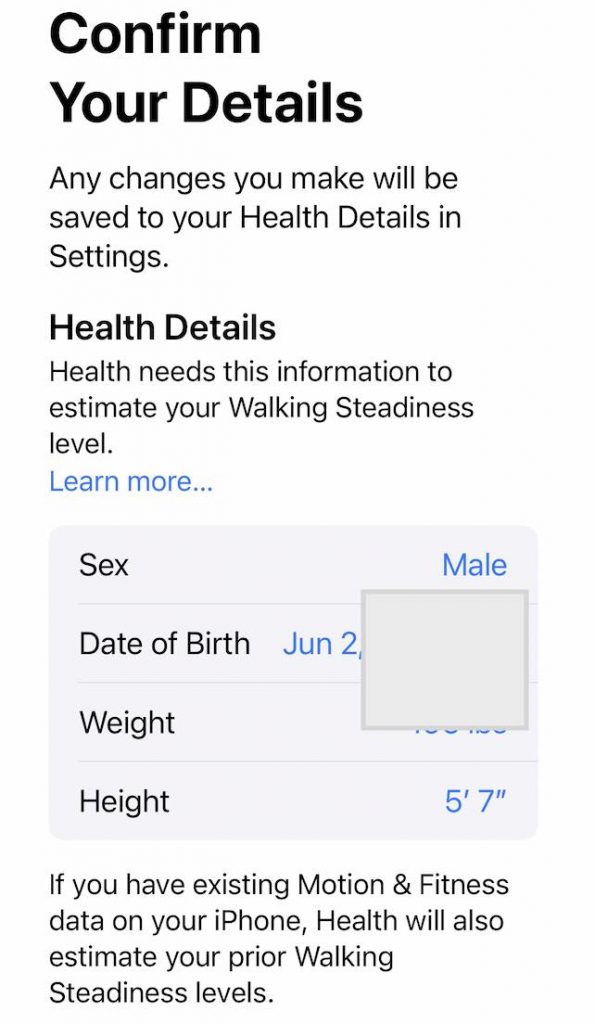 - The Setup process is easy and starts with confirming your basic health data such as sex, age, weight, and height. ( Required for estimating a person’s walking steadiness score)