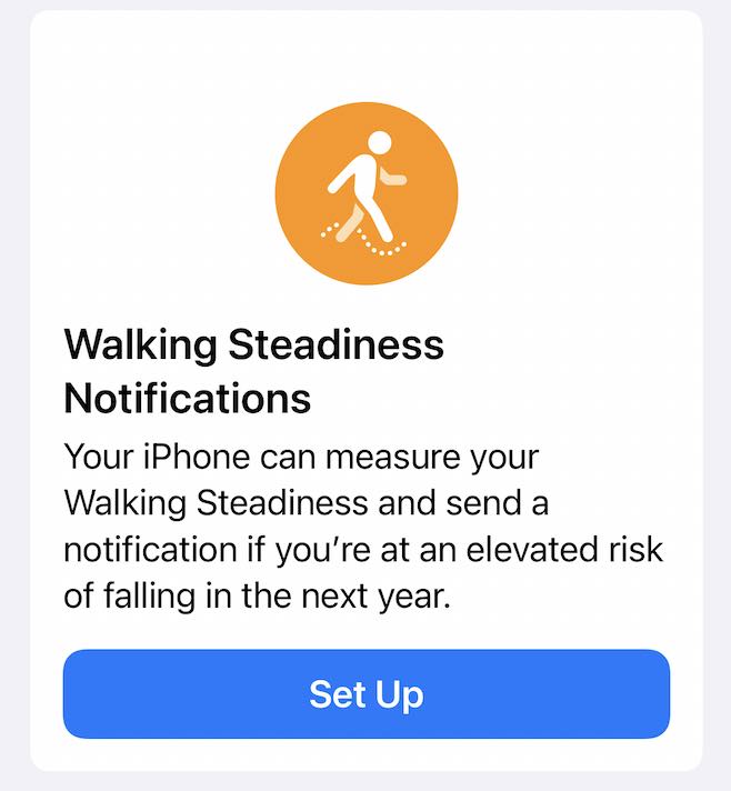 - Go to the Summary tab and scroll to the Walking Steadiness Notifications prompt, then tap Set Up.