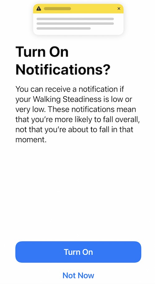 - The next setup screen helps you turn on the notifications for walking steadiness.