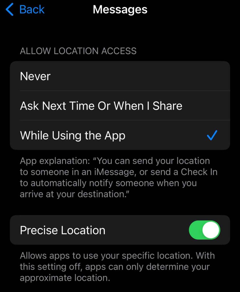 Go to Settings > Privacy & Security > Location Services. Turn on Location Services, then scroll down and tap the Messages app and choose While Using the App. We also recommend toggling on Precise Location.