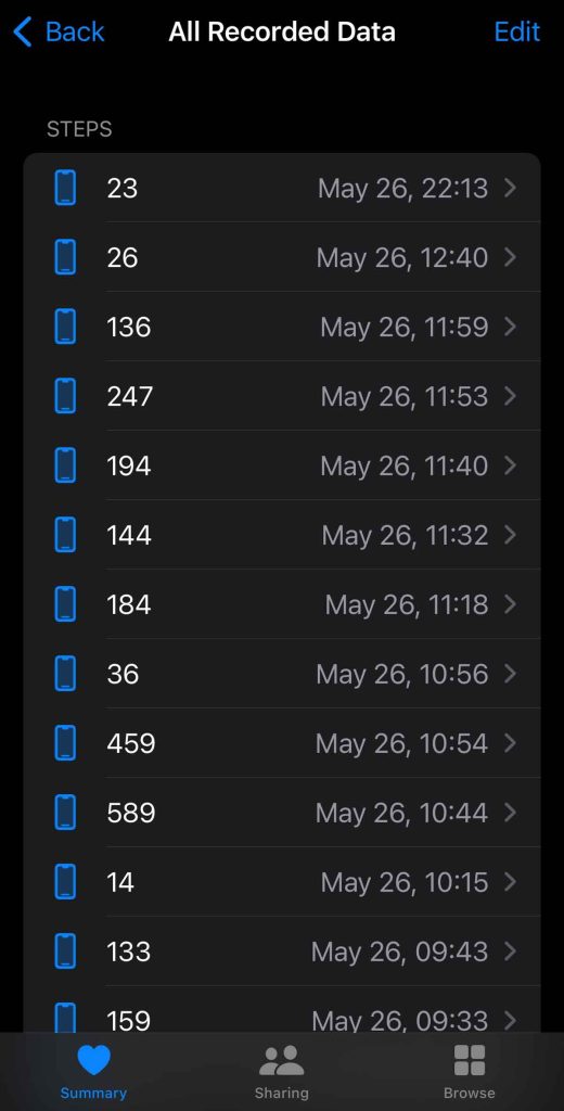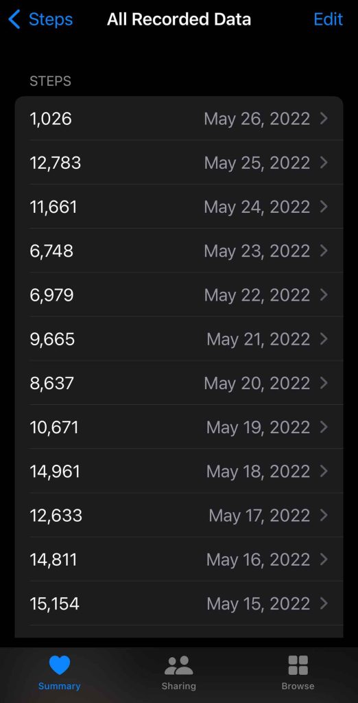 - Once you do that, all of your recorded daily step totals pop up–these include steps from any connected apps, smartwatches, or trackers and steps counted by your iPhone.