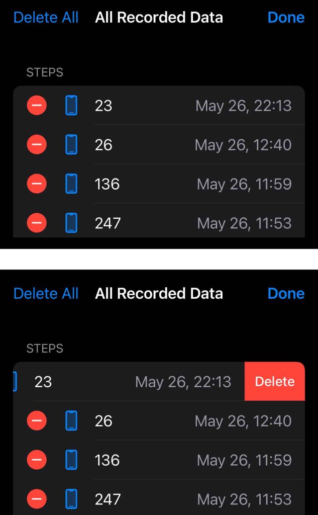 - Or tap the Delete All button in the left-hand corner to delete all entries for the day–that includes all steps from just your iPhone, not any wearables or third-party apps.