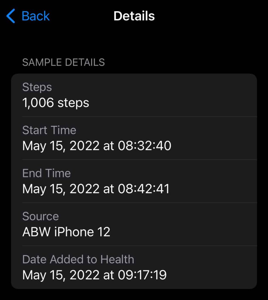 - To get more information about a step count, tap on it. You see the source, the total count, and the start and end times your iPhone and the Health app recorded those steps.