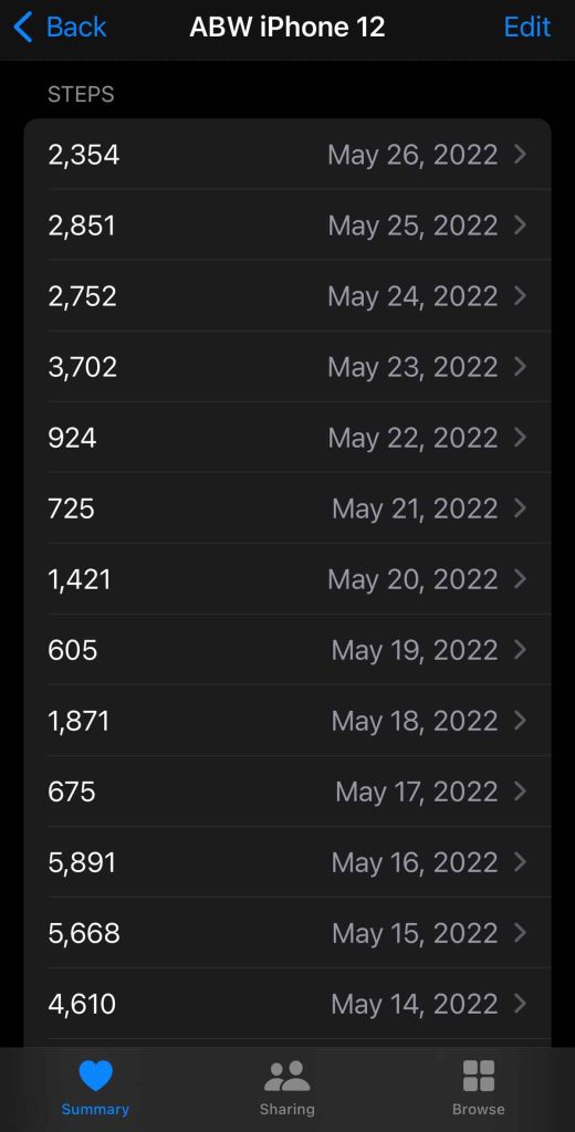 - You see a list of steps counted with your iPhone by date. Tap on an entry to see more.