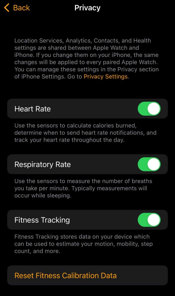 - Open the Watch app on your iPhone and choose the My Watch tab > Privacy. Verify that you turned on Heart rate, Respiratory Rate, and Fitness Tracking.