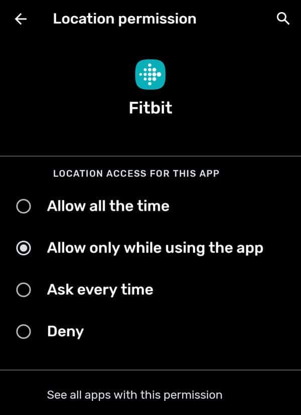 If you don’t see Fitbit listed in your apps, open the Fitbit app, and choose the exercise tile. Then, tap on the stopwatch icon in the top corner to open location services.