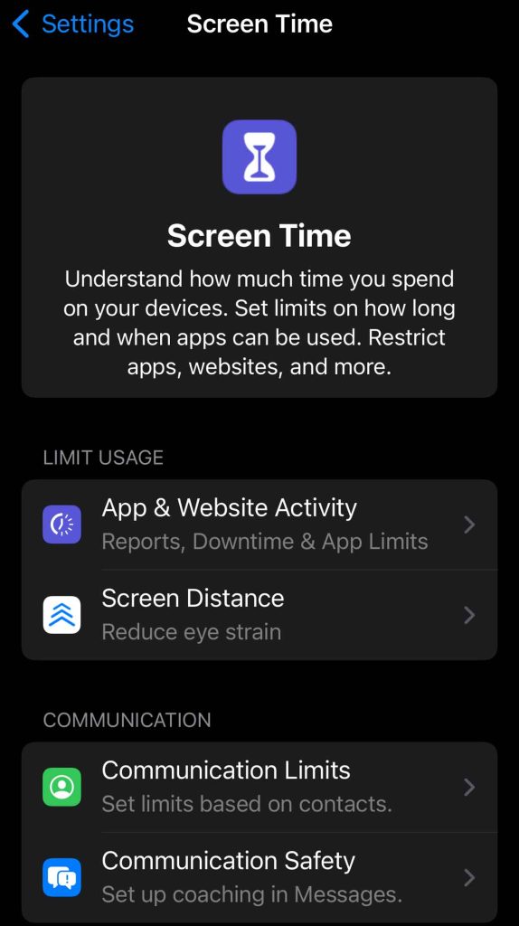 Now, you’d think that turning Screen Distance on and off is part of the Health app, but it’s not! Instead, you find this feature inside Screen Time.