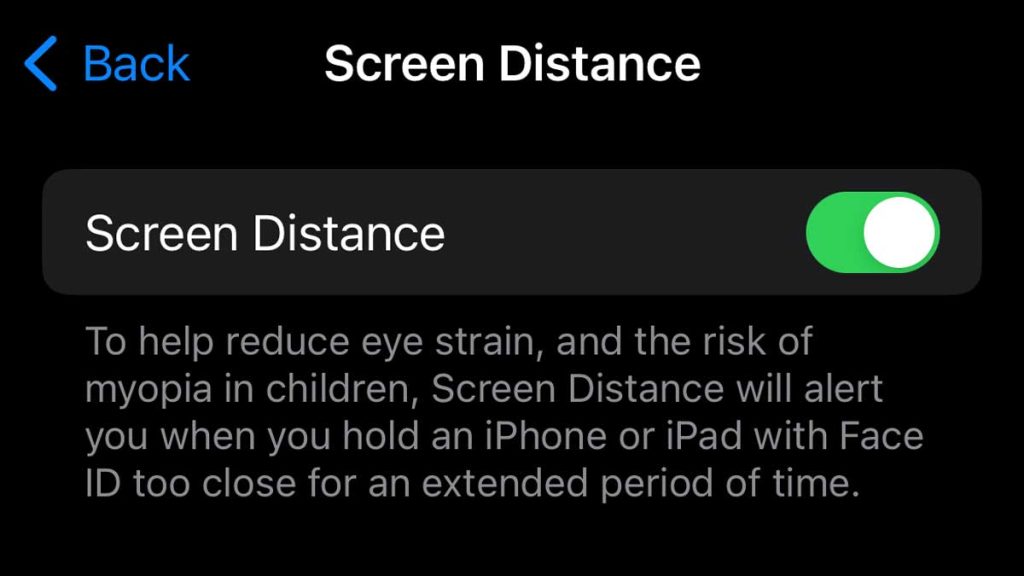 Now, Screen Distance is available on devices that offer Face ID via Apple’s TrueDepth camera, including iPhone models with Face ID, iPad Pro 12.9-inch (3rd generation and later), and iPad Pro 11-inch (1st generation and later).