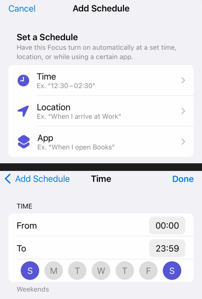- Add Schedule allows you to tell Apple when you want this Focus to turn on. Options include turning it on at a particular time or day, at a specific location (like when you arrive at your vacation spot), or when you open a specific app.