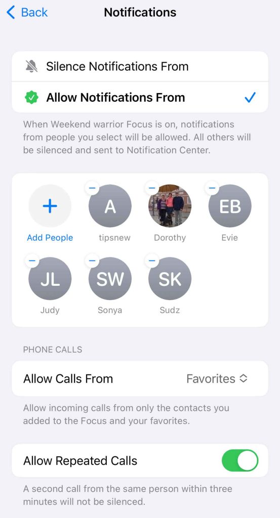 Now you have a custom focus on your iPhone that only allows notifications from your selected apps and contacts during the weekends.