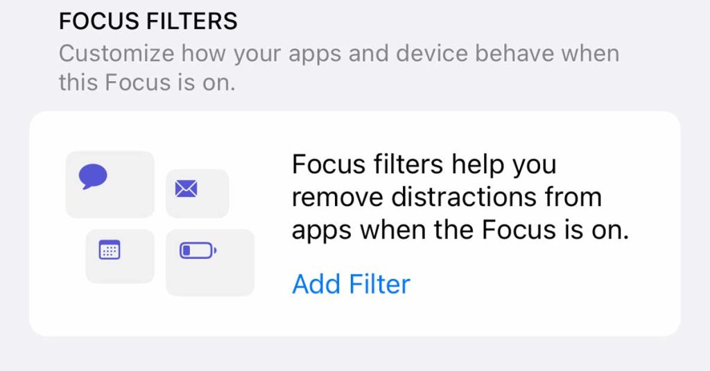 - Finally, go to the section Focus Filter if you want to choose what information your selected apps show when the Focus is on. If you don’t want to adjust your apps’ behavior when this Focus is on, skip this section.