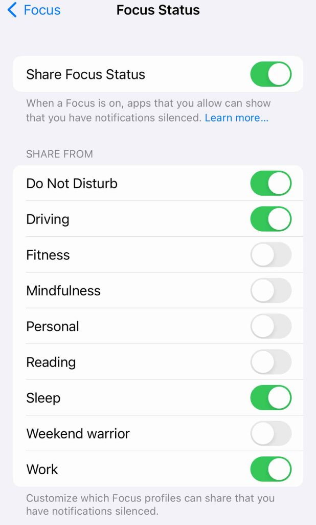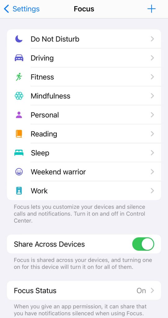 - Scroll down past your individual focuses and find options to Share Across Devices and Focus Status.