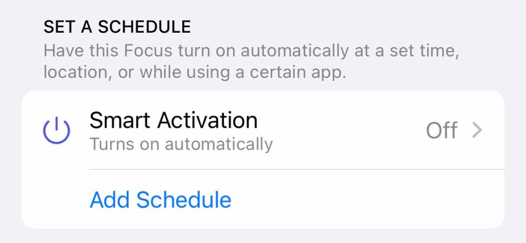 - Smart Activation lets your iPhone learn from your behavior and automatically turns on your Focus at relevant times throughout the day based on what it learned, including things like location, time, or app usage. Since you don’t have control of this, we don’t recommend this setting.