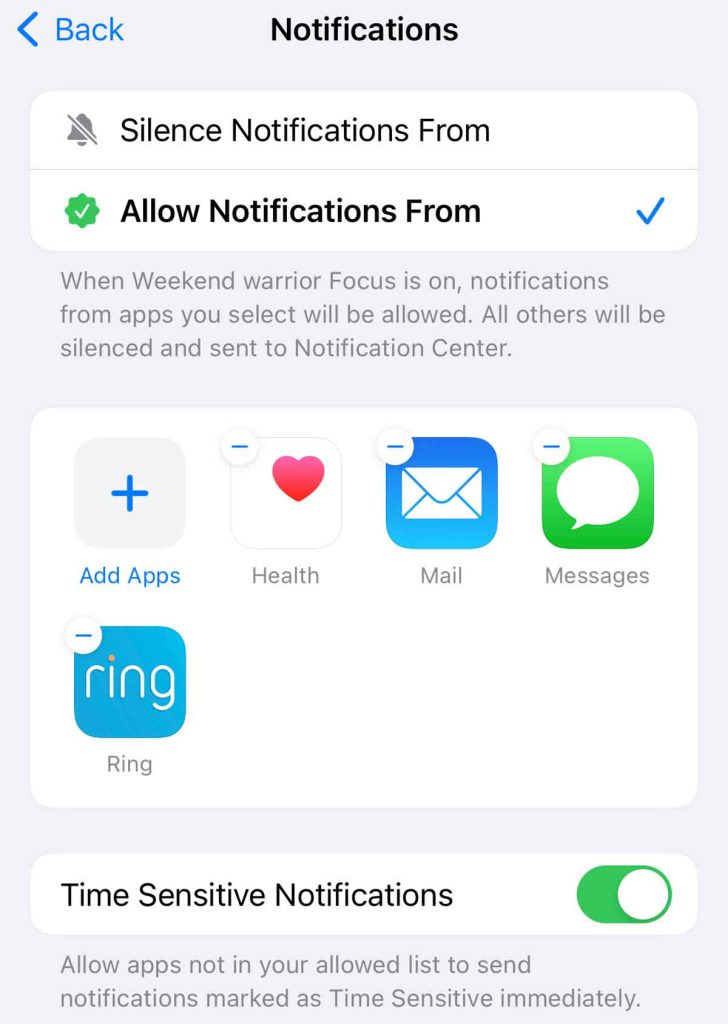 The trick with setting up a Focus is to choose what apps and people you want to allow notifications from–any apps or contacts you don’t allow are automatically turned off (silenced.)
