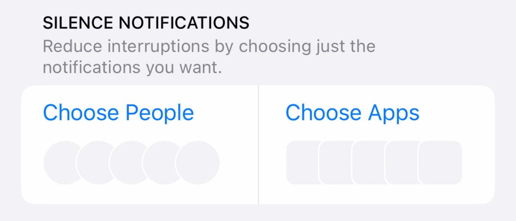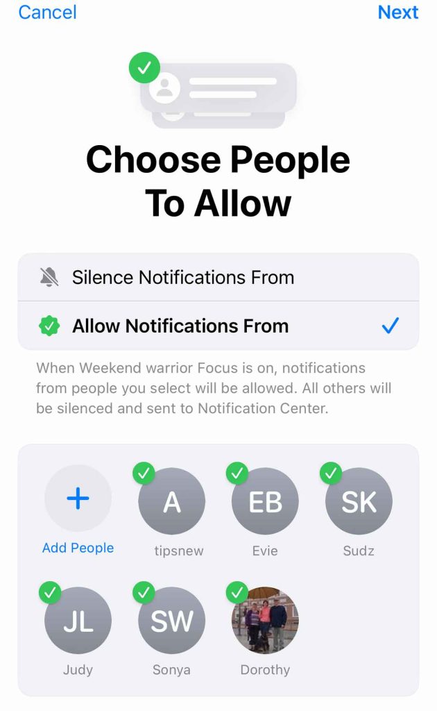 - In the Silence Notifications section, tap and select Choose People and Choose Apps to allow selected contacts and apps to contact you when you turn on that Focus.