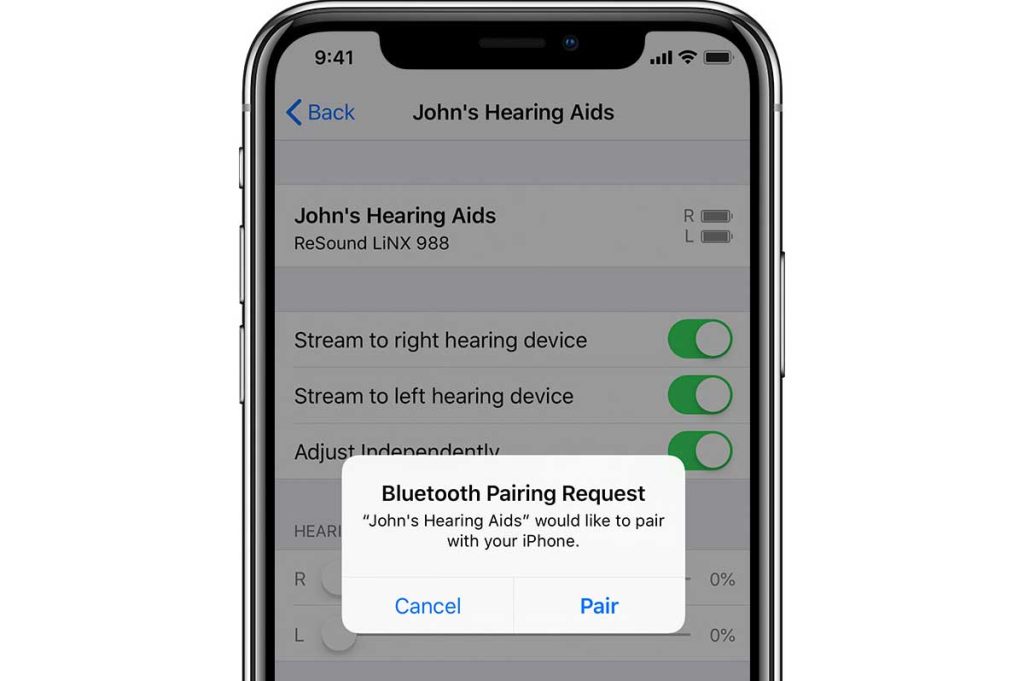 - Look for the pairing request for your hearing aids to pair them. Tap Pair to initiate the pairing.