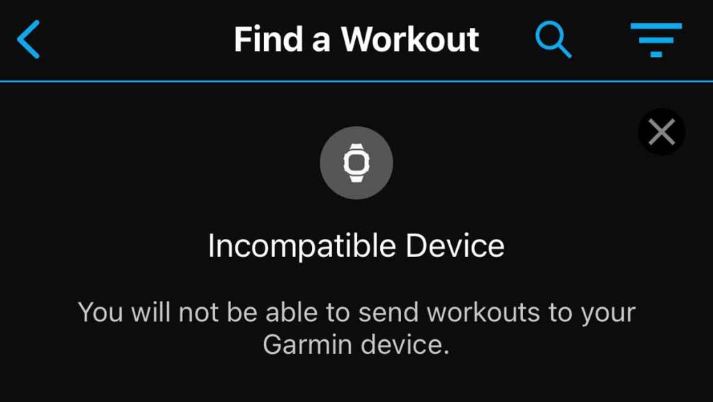 - Pay attention to the top section. If you see a message that your device isn’t compatible, you cannot send workouts to your Garmin watch or tracker. But you can still tap on these workouts to see their details and more and follow along in Garmin Connect!