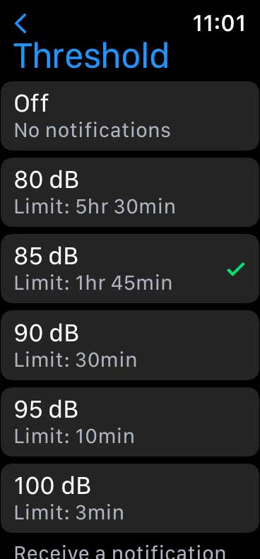 - Tap and choose or change your preferred setting for decibels and time. You can also turn it off, so you receive no notification.