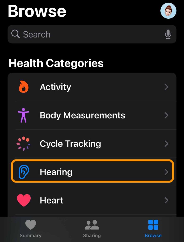 To check on daily, hourly, weekly, or even monthly audio levels from either the environment or your headphones, go to the Hearing category within the Health app.