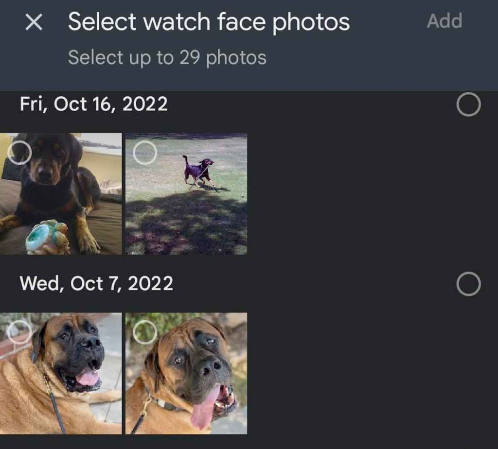 If you’re trying to add your photos from your Google Photos app’s gallery but you aren’t seeing any options to add photos, you likely need to update the Photos app on your watch.