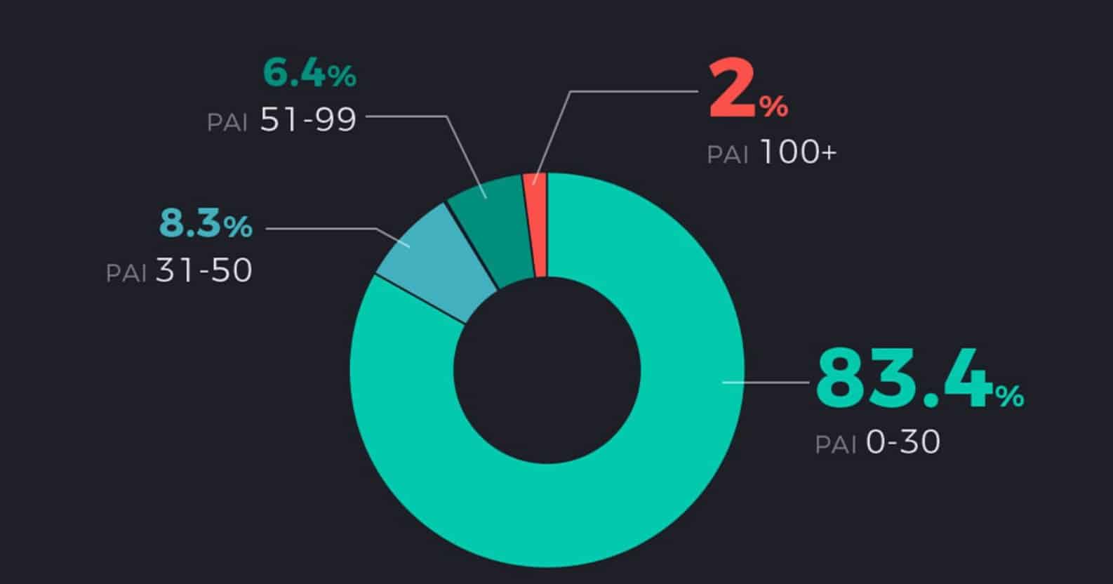 The report shows that 83.4% of people have an average daily PAI (Personal activity intelligence score) value of 0 – 30 with only 2% have the ideal daily PAI value of 100 or more.