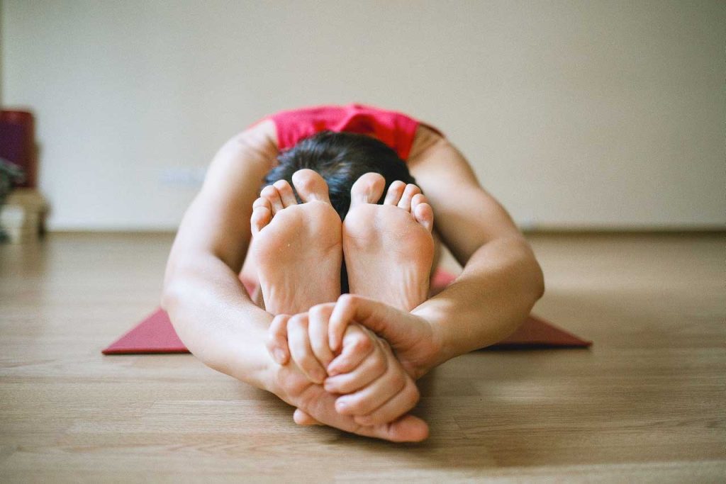 - Paschimottanasana (Seated forward bend) stretches your spine, hamstring, and lower back while relieving stress and reducing fatigue. Stay in this position for 60 seconds.