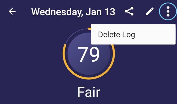 - For Android phones, tap the pencil icon at the top right to edit the log and tap the three dots More button in the top right to delete the log.