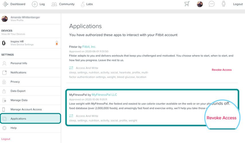 - For Fitbit’s website, go to Settings > Applications > and revoke access to MyFitnessPal by MyFitnessPal LLC.