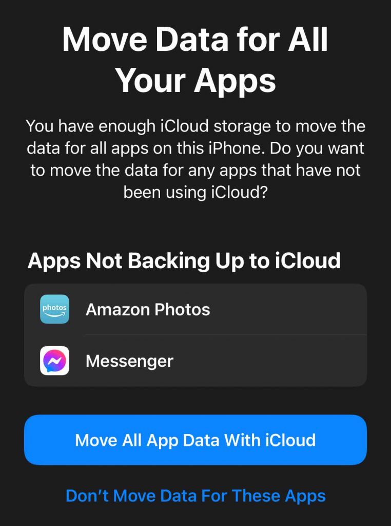 Plus, it works even if you don’t have a paid iCloud subscription or enough iCloud storage to back up all your important data! This feature gives you free and temporary access (about 2-3 weeks) to enough iCloud storage to seamlessly back up and transfers your old iPhone’s data to your new iPhone.
