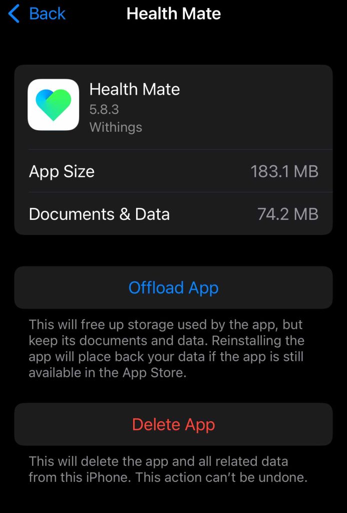 - When the app’s storage page opens, you’ll have two options: delete or offload the app. Make sure you press Offload App! If you press Delete App, you’ll lose the app’s data.