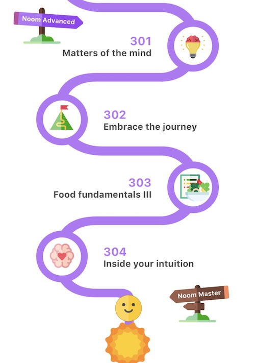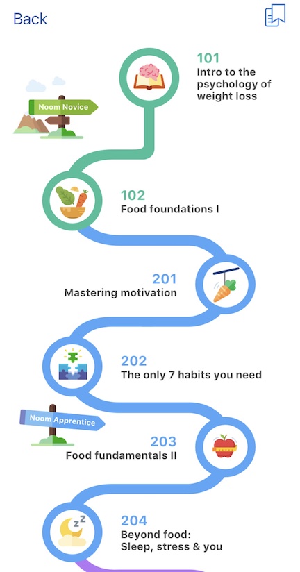 Once you do this, you’ll start your Noom course. The goal of the course is to make you a Noom Expert, but there are other levels you need to reach first, like Novice, Apprentice, and Scholar.