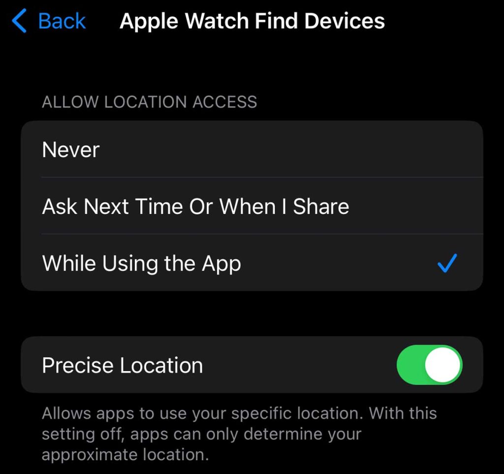We also recommend toggling on Precise Location for both the Find My app and Apple Watch Find Devices.